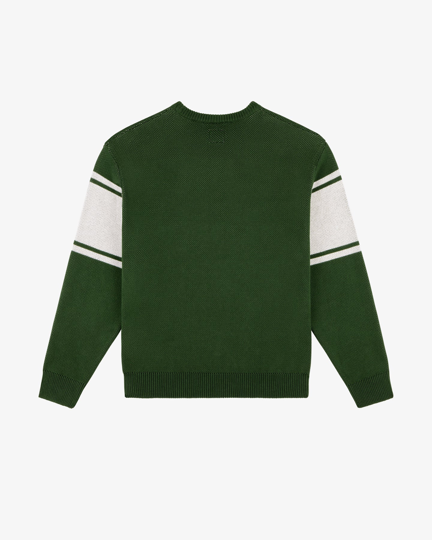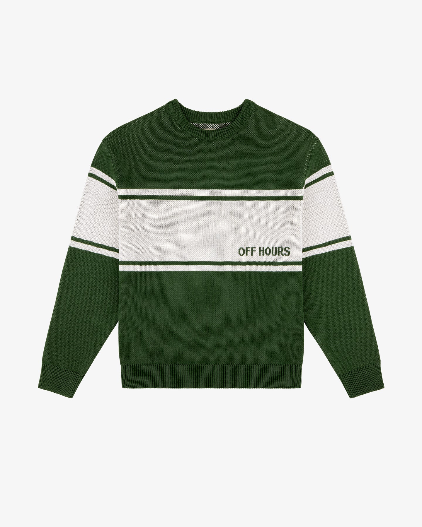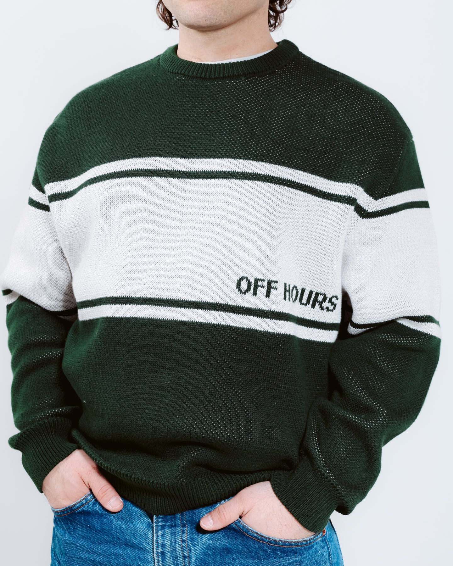 Retro fit crewneck knit sweater, featuring needle knit Off Hours logo off-centered on front. Full needle rib facing 1x1 ribbed hem & cuffs. Made from 100% organic combed cotton yarns. Produced seed to sew in Turkey.