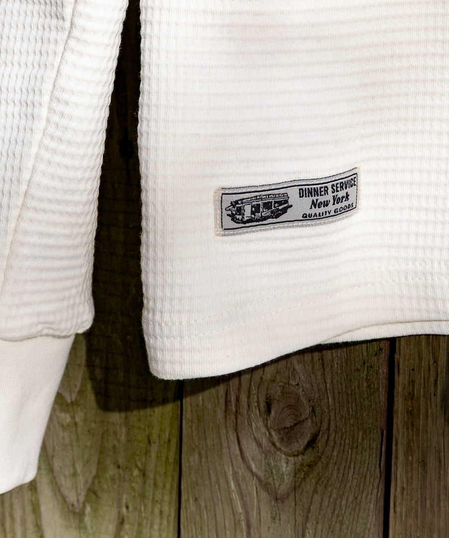 Rooted in traditional workwear, this waffle thermal is made from heavyweight 12 oz, 100% cotton. The dense knit gives it a substantial feel while remaining breathable and comfortable. The classic waffle construction provides natural insulation and helps maintain structure over time. Produced seed-to-sew in Pakistan, with oversight at every stage from fiber to finished garment.
