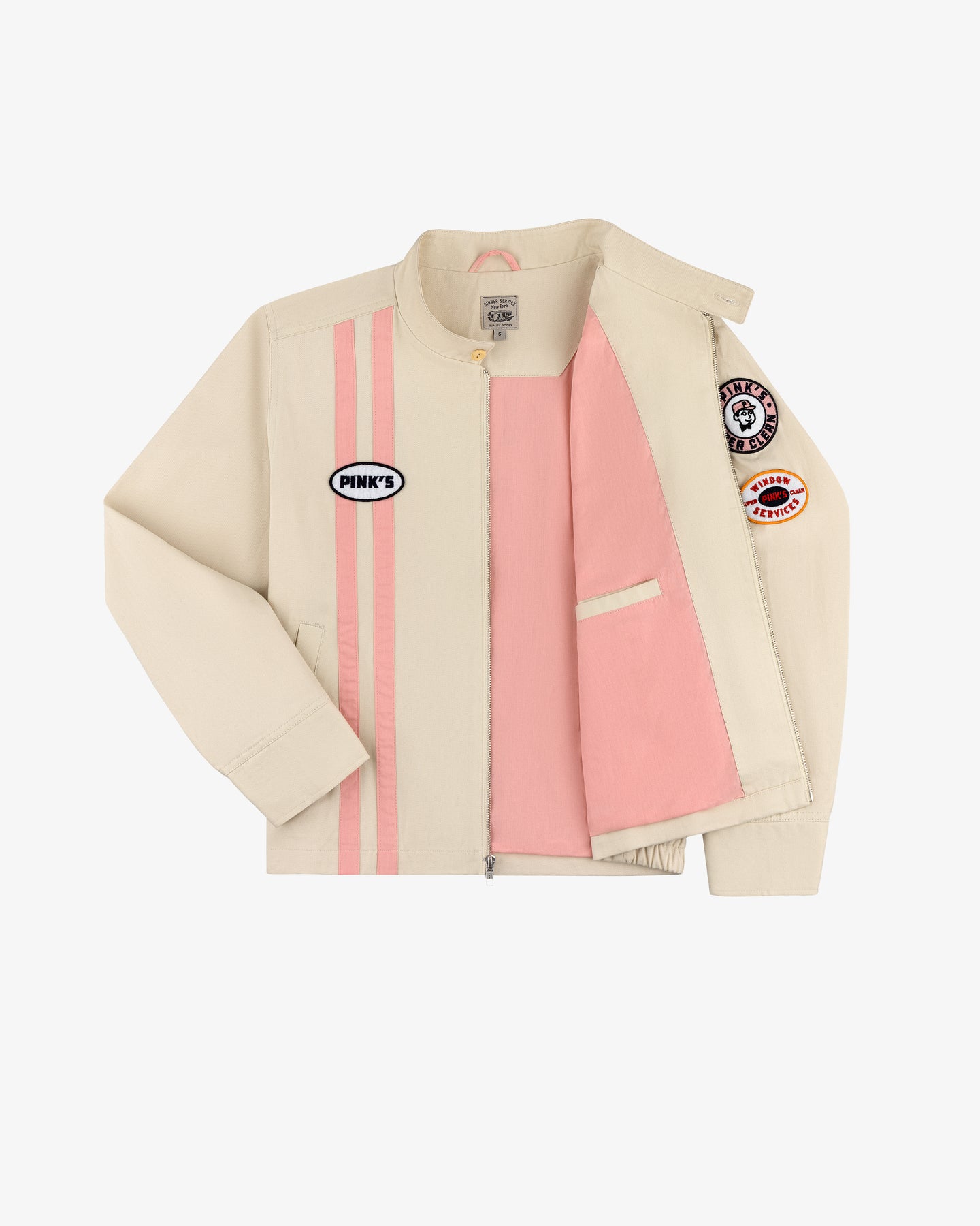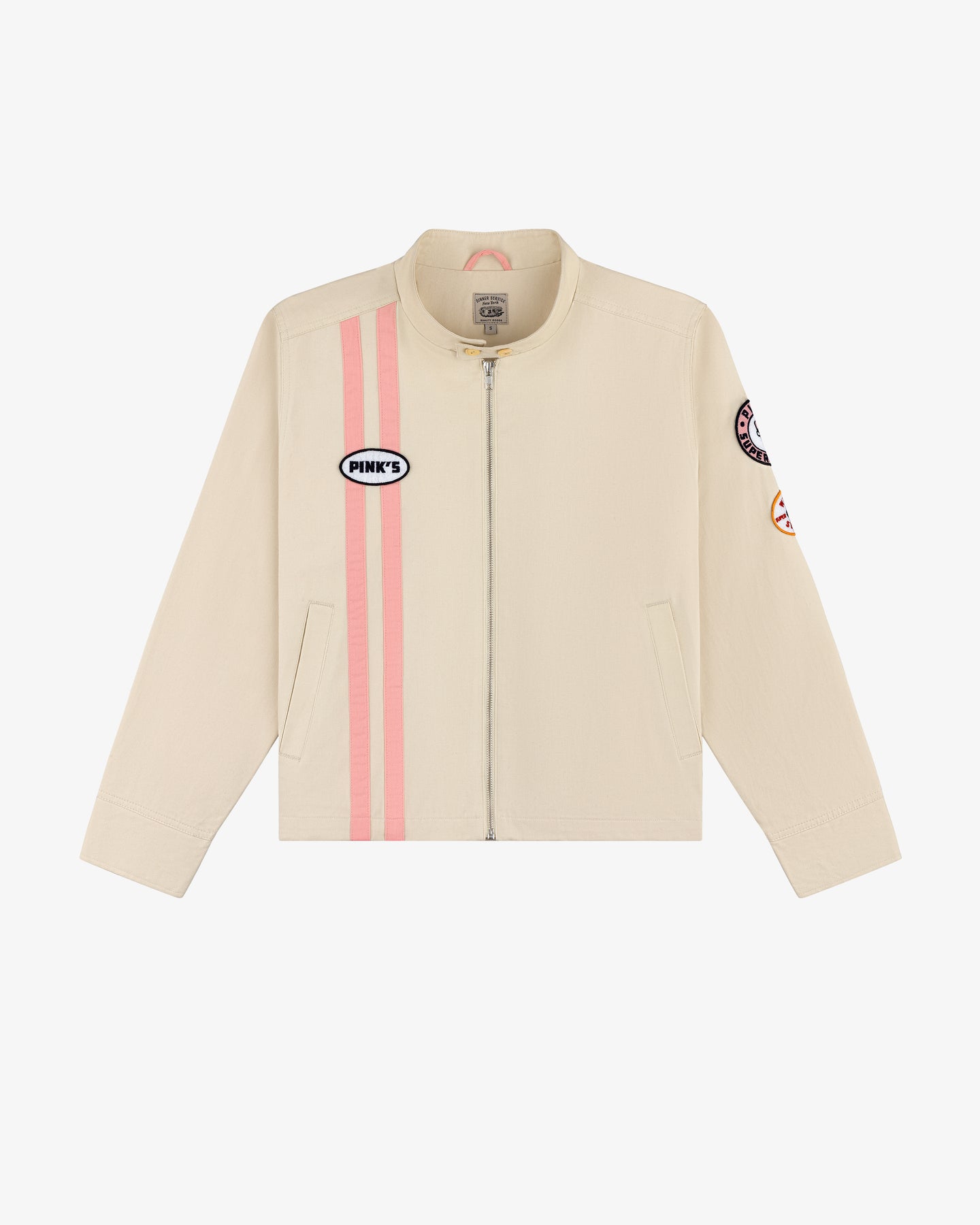 Heritage racing jacket, embodying timeless Americana style. Crafted from lightweight cotton twill outer shell with lightweight cotton poplin lining. Featuringembroidered patches on the chest and sleeve, and an inside chest pocket.
